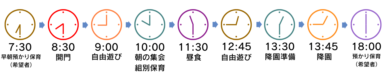 これらの他にも、毎月「お誕生日会」や「仲良しお弁当」「身体測定」などがあります。どの行事も子ども達は楽しみにしていて積極的に参加しています。 8月には夏季保育(3日間)、プール集中レッスン(4日間)があります。 2・3才児の為の幼児サークル(こばとクラブ)を月1回実施しております。